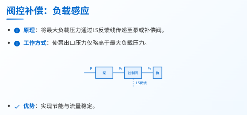 為了解決這一關(guān)鍵問(wèn)題,確保執(zhí)行元件在負(fù)載變化時(shí)仍能獲得相對(duì)恒定的流量(從而保持穩(wěn)定的速度),工程師們引入了壓力補(bǔ)償這一核心技術(shù)。壓力補(bǔ)償是指液壓系統(tǒng)中采取特定措施,主動(dòng)抵消或平衡因負(fù)載變化引起的壓力波動(dòng),從而維持關(guān)鍵工作參數(shù)(特別是流量)相對(duì)穩(wěn)定的過(guò)程和方法。