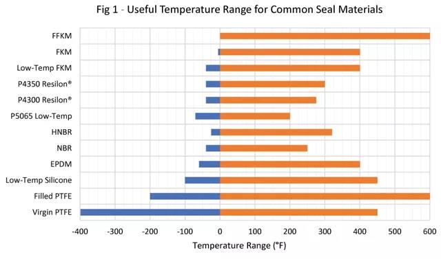 純(未填充的)PTFE雖然不被視為彈性體,但它在低至-425°F的溫度下卻仍有柔韌性,這一溫度只比絕對(duì)零度(可達(dá)到的最低溫度)高35度。圖1中的圖表展示了派克密封材料的有效范圍。