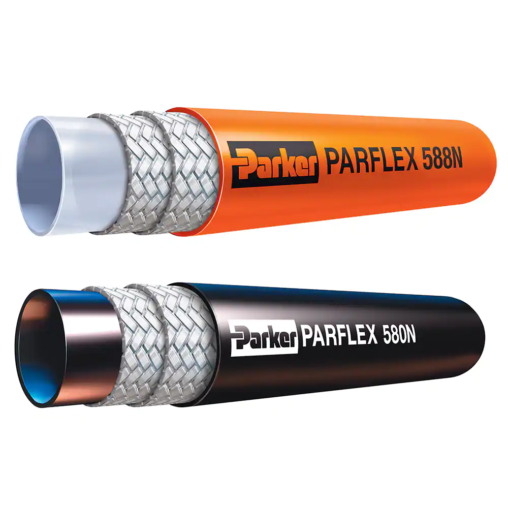 派克580N/H580N/588N高壓軟管符合SAE 100R8標準要求,比常見的100R2橡膠液壓軟管重量輕且外徑小,在需要更好柔韌性、流體兼容性以及表面持久耐磨性的應用場合中能替換100R2橡膠液壓管。該系列軟管采用高標準的設計理念,可以提供雙聯和多聯結構,在液壓和氣動系統應用中表現出卓越的產品性能。由于具有更優良的產品特性,比如重量輕、柔韌能力更好,Parflex 580N/H580N/588N高壓軟管集中了諸多優點于一身,適用于流體處理和工業氣動市場。