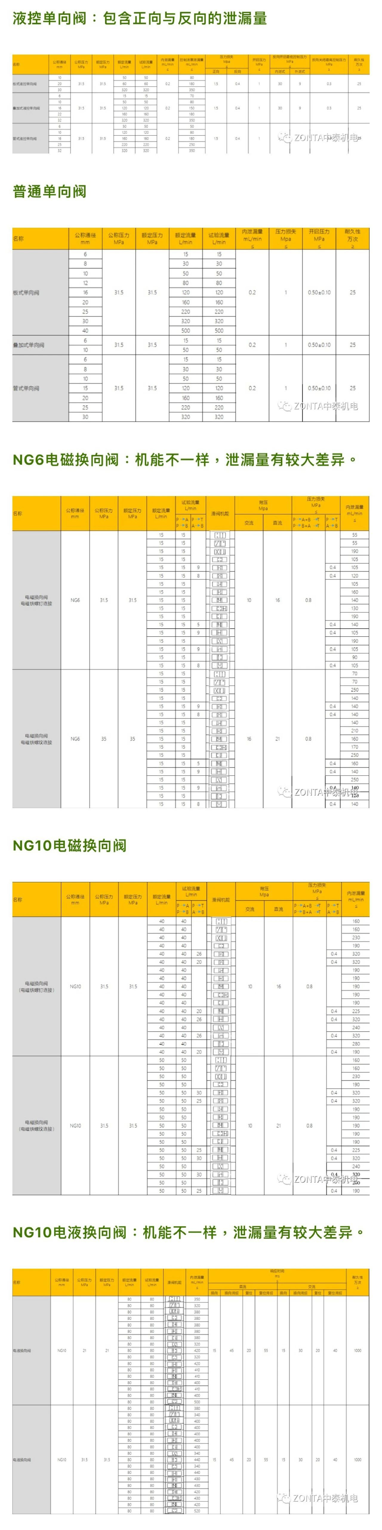 對常用的液壓閥,如液控單向閥、普通單向閥、電磁換向閥、電液換向閥、溢流閥、調速閥、減壓閥等的內泄漏/外泄漏進行了統計,這些參數可以作為系統工程師在設計系統時候的參考。需要說明的是,這些僅僅是行業標準規定的,其具有一定的測試條件,具體品牌或產品的數值肯定會有不一樣,應該高于該指標值才行。