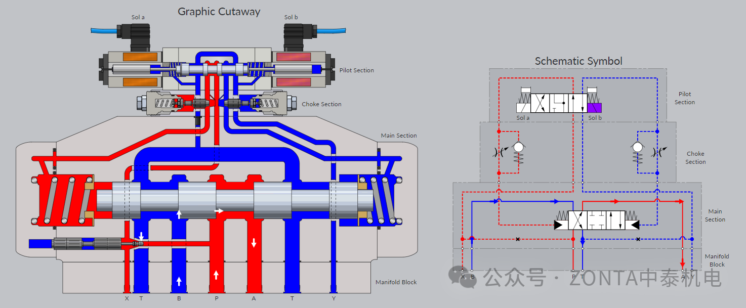 E型中位機能換向閥電磁鐵得電時的閥芯動作