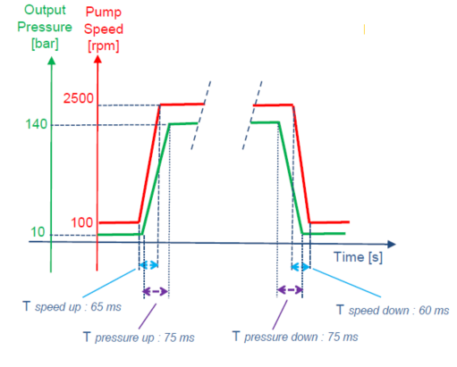 紅色曲線是速度閉環控制響應曲線,綠色曲線為壓力閉環控制響應曲線。為了防止氣穴現場發生,應避免壓力上升和下降梯度超過極限 值,建議壓力上升梯度極限≤2500bar/s,下降 梯度極限≤3000bar/s。